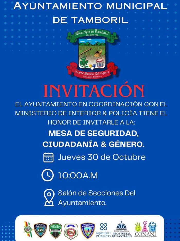 El Ayuntamiento Municipal de Tamboril, bajo la dirección del Licdo. Anyolino Germosén, en colaboración con el Ministerio de Interior y Policía, llevó a cabo el 7mo Encuentro de la Mesa de Seguridad, Ciudadanía y Género, con el objetivo de seguir fortaleciendo la seguridad, el orden y el bienestar de todos los tamborileños. Durante el encuentro, se presentaron los informes y acciones de las diferentes instituciones que integran esta mesa de trabajo.