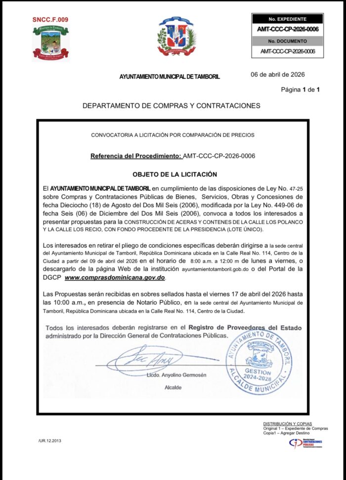 El Ayuntamiento Municipal de Tamboril, encabezado por el Licdo. Anyolino Germosén, informa que se encuentra publicado en el Portal Transaccional de Compras y Contrataciones Públicas el proceso