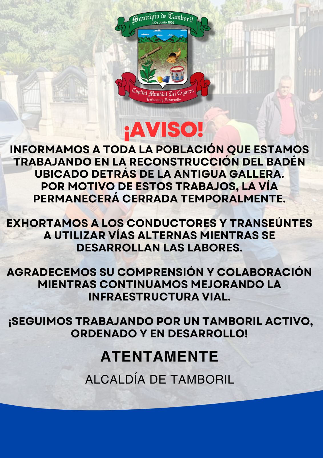 El Ayuntamiento Municipal de Tamboril, bajo la dirección del Licdo. Anyolino Germosén, informa a toda la ciudadanía que se están realizando trabajos de reconstrucción del badén ubicado detrás de la antigua gallera.
