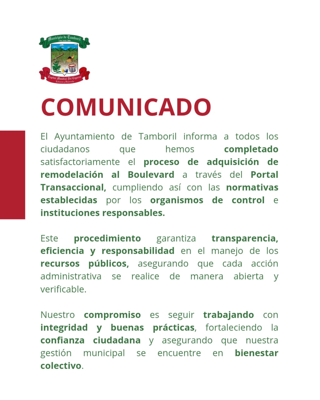 Los pliegos de condiciones específicas están disponibles a partir del día 25 de Agosto de 2025, a través del Portal Transaccional de la Dirección General de Contrataciones Públicas (www.comprasdominicana.gob.do) y en la página institucional del Ayuntamiento Municipal de Tamboril (www.ayuntamientotamboril.gob.do)